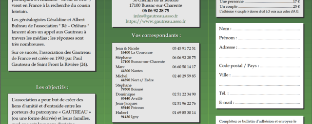 Vous pourrez y trouver des informations généalogiques, des services pour voyager, ou tout simplement découvrir d’autres GAUTREAU près de chez vous et au cours de l’assemblée annuelle.